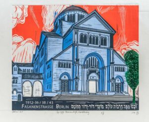 Synagogue in Fasanenstrasse in Charlottenburg, Berlin. During the November 1938 pogrom the synagogue was burned dow. The ruin was further damaged by Allied air raids in 1943. In 1957 the synagogue was replaced by the building of the Jewish Community Centre. I added the Hebrew inscription “Men from your midst shall rebuild ancient ruins, You shall restore foundations laid long ago” (Isaiah 58:12)